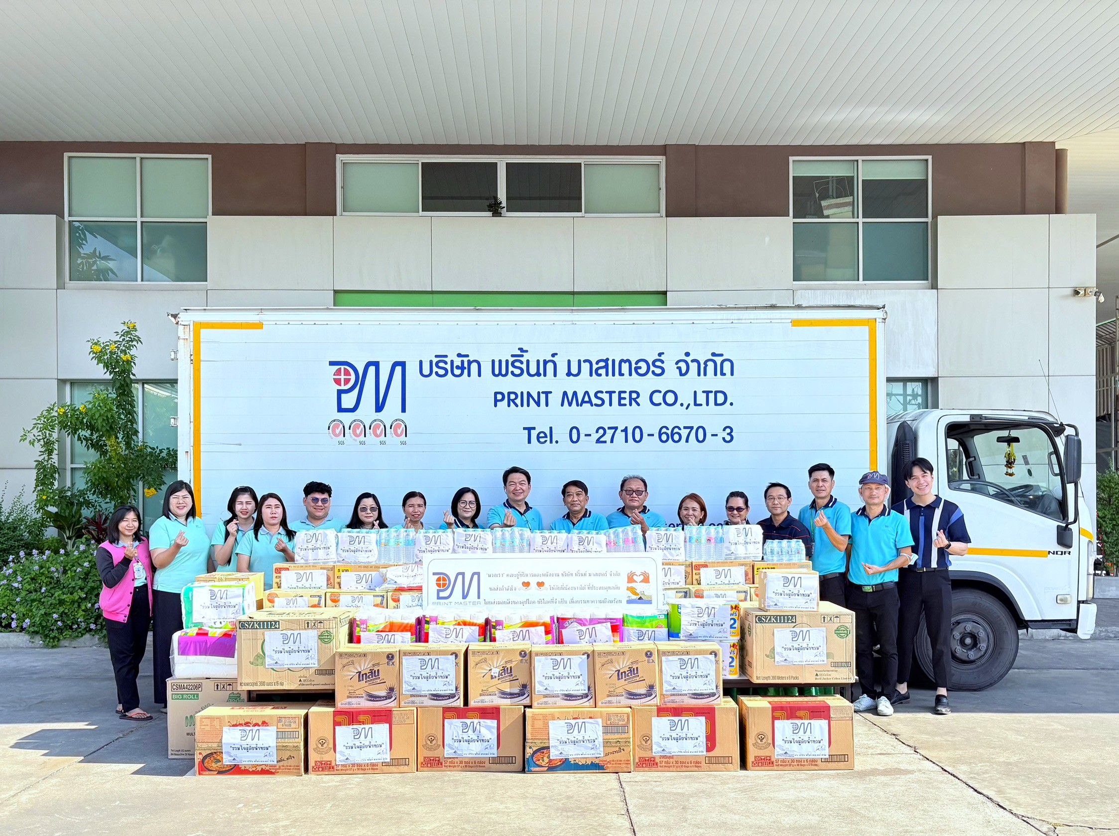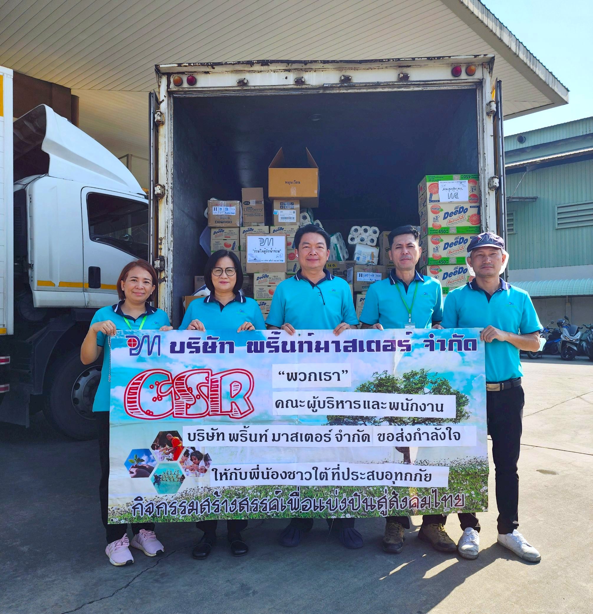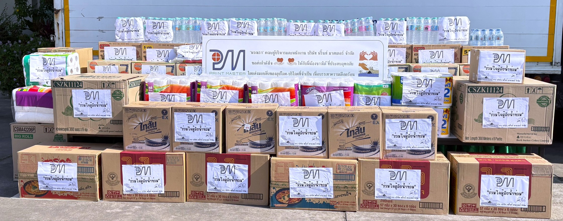 คณะผู้บริหารและพนักงาน บริษัท พริ้นท์ มาสเตอร์ จำกัด ได้ร่วมแรงร่วมใจกันจัดเตรียมสิ่งของจำเป็น อาทิ บะหมี่กึ่งสำเร็จรูป ขนมเค้ก น้ำดื่ม น้ำผลไม้ น้ำยาล้างห้องน้ำ และกระดาษชำระ เพื่อช่วยเหลือและบรรเทาความเดือดร้อนให้แก่พี่น้องผู้ประสบอุทกภัยในพื้นที่ภาคใต้